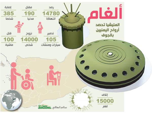 من جهة ثانية، أعلن مكتب حقوق الإنسان بمحافظة الجوف أمس عن مقتل وإصابة أكثر من 500 مدني نتيجة الألغام التي زرعتها المليشيا في المحافظة منذ الانقلاب على السلطة.