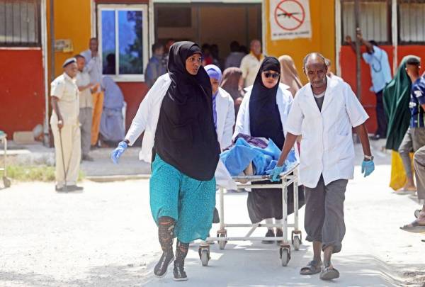 مسعفات في مستشفى المدينة بالعاصمة مقديشو ينقلون جرحى مدنيين أصيبوا في انفجار خارج فندق بالقرب من المطار الدولي أمس. (رويترز)