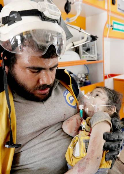 أحد أفراد الدفاع المدني السوري، يحمل طفلاً سوريا مصابا بعد أن أخرجه من تحت الأنقاض في أعقاب غارة جوية روسية على معرة النعمان في محافظة إدلب شمال غرب سورية أمس. (أ.ف.ب)
