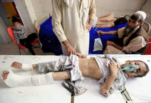 طفل أفغاني يتلقى العلاج إثر إصابته بانفجار قنبلة على جانب أحد الطرق الرئيسية في جلال آباد أمس. (رويترز)