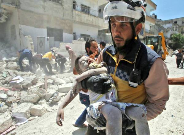 أحد أفراد الدفاع المدني السوري يحمل جثة طفل في موقع غارة جوية على بلدة أريحا جنوب محافظة إدلب أمس. (أ ف ب)
