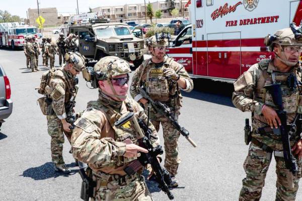 “قوات إنفاذ القانون” تحيط موقع إطلاق النار في متجر “وول مارت” في مدينة إل باسو بولاية تكساس، أمس الأول (أ.ف.ب.)