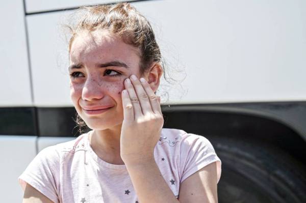طفلة سورية لاجئة في تركيا تبكي بسبب ترحيل أفراد من عائلتها المقيمة في حي إسنيورت في إسطنبول إلى سورية أمس. (أ. ف. ب)