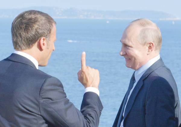 بوتين وماكرون خلال اجتماع في فورت بريجانكون في فرنسا أمس. (رويترز)