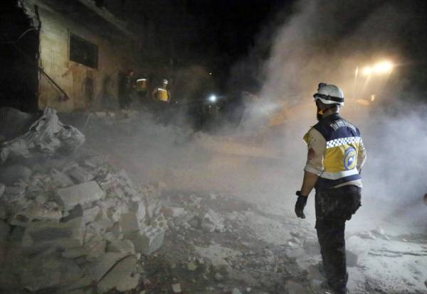 Members of the Syrian Civil Defence (White Helmets) sift through the rubble of a building following a reported government air strike in the area of Maaret al-Numan in Syria's northwestern Idlib province on August 22, 2019. Damascus said it is opening a corridor for civilians to leave the rebel-held northwestern region of Idlib, where government bombardment has killed hundreds since late April, state media said. / AFP / Abdulaziz KETAZ