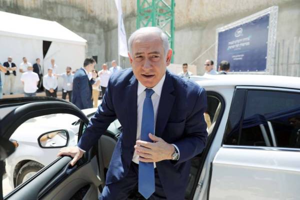 نتنياهو يخرج من سيارة خلال حفلة لوضع حجر الأساس لمستوطنة شمال غرب القدس المحتلة أمس. (أ ف ب)