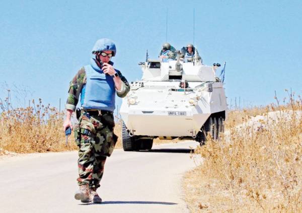 جنود أيرلنديون من (اليونيفيل) خلال دوريات جنوب لبنان على طول الحدود مع إسرائيل أمس. (أ ف ب)