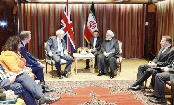 روحاني وجونسون خلال لقائهما على هامش الدورة 74 للجمعية العامة للأمم المتحدة في نيويورك أمس الأول. (أ ف ب)