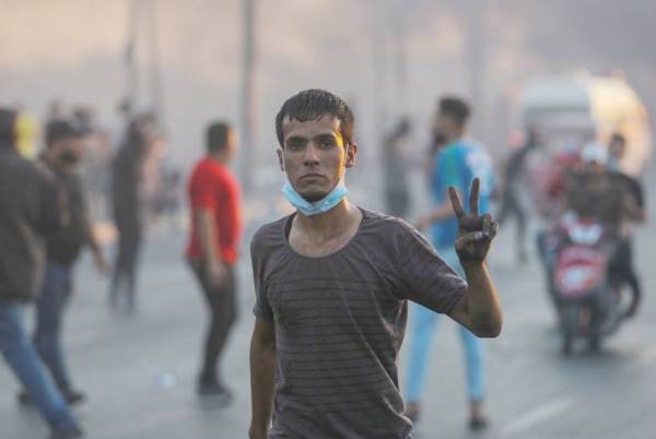 عراقي يشير بعلامة النصر خلال احتجاجات حاشدة ضد الفساد والبطالة في بغداد أمس الأول. (أ.ف.ب)