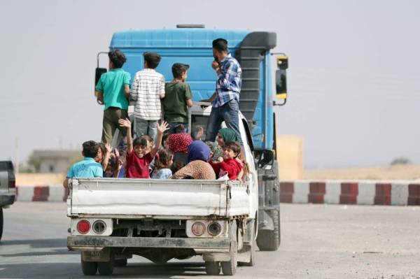 شاحنة تحمل سوريين فارين من العدوان التركي في بلدة تل أبيض أمس. (رويترز)