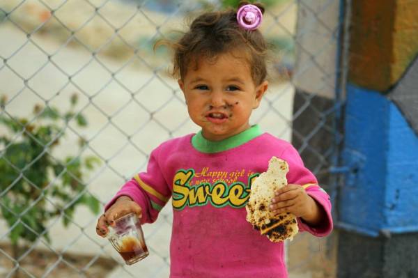 طفلة تحمل رغيف خبز في مخيم مبروكة، بالقرب من رأس العين، أمس الأول. (رويترز)