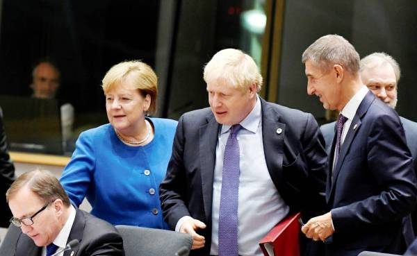 جونسون وميركل خلال قمة قادة الاتحاد الأوروبي في بروكسل أمس. (رويترز)