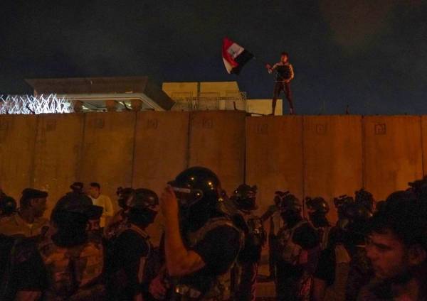 وقبل وقت قصير من إطلاق النار الغزير، رفع المتظاهرون الأعلام العراقية فوق الكتل الإسمنتية المحيطة بالمبنى القنصلي الواسع حيث يرفرف علم إيران.