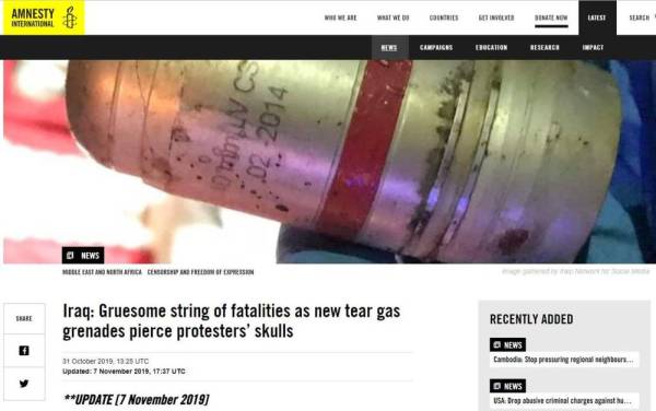 كشفت منظمة العفو الدولية أن إيران مصدر القنابل القاتلة المستخدمة ضد المحتجين في العراق. وأعلنت في تقرير حديث نشرته أمس (الجمعة) أن أجهزة الأمن تستخدم قنابل مسيلة للدموع من صنع إيراني لقتل المحتجين بدل تفريقهم، وفقاً لأدلة جديدة. وأكدت المنظمة أنها قامت بمزيد من التحقيقات على القنابل الدخانية التي يبلغ حجمها 40 ملم وتستعمل لقتل المحتجين. وأظهرت الأدلة الجديدة أن الجزء الكبير من هذه القنابل الفتاكة من صنع «منظمة الصناعات الدفاعية الإيرانية»، وهي من نوع M651 وM713. وأفادت بأنها حصلت على أدلة من مصادر على الأرض، لأربع وفيات إضافية بسبب القنابل الإيرانية والصربية.