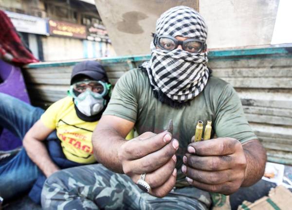 متظاهر عراقي يعرض رصاصا يدعي أن قوات الأمن استخدمته في ميدان خلاني ببغداد خلال المظاهرات المناهضة للحكومة. (أ.ف.ب)