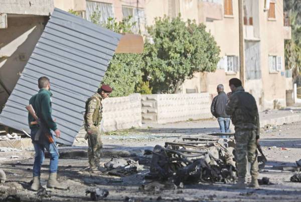مقاتلون سوريون موالون للنظام التركي يقفون أمام حطام عربة متفجرة في رأس العين شمال محافظة الحسكة على الحدود التركية السورية أمس. (أ.ف ب)