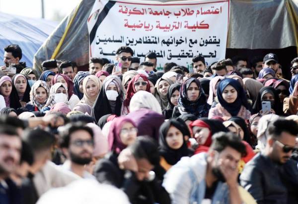 طلاب عراقيون في جامعة الكوفة يتظاهرون عند بوابة الحرم الجامعي في مدينة الكوفة أمس. (أ ف ب)
