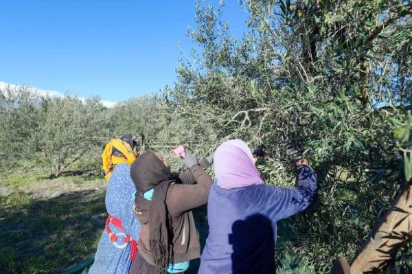 نساء يجمعن محصول الزيتون في قرية كسرة الجبلية التونسية أمس الأول. (أ ف ب)