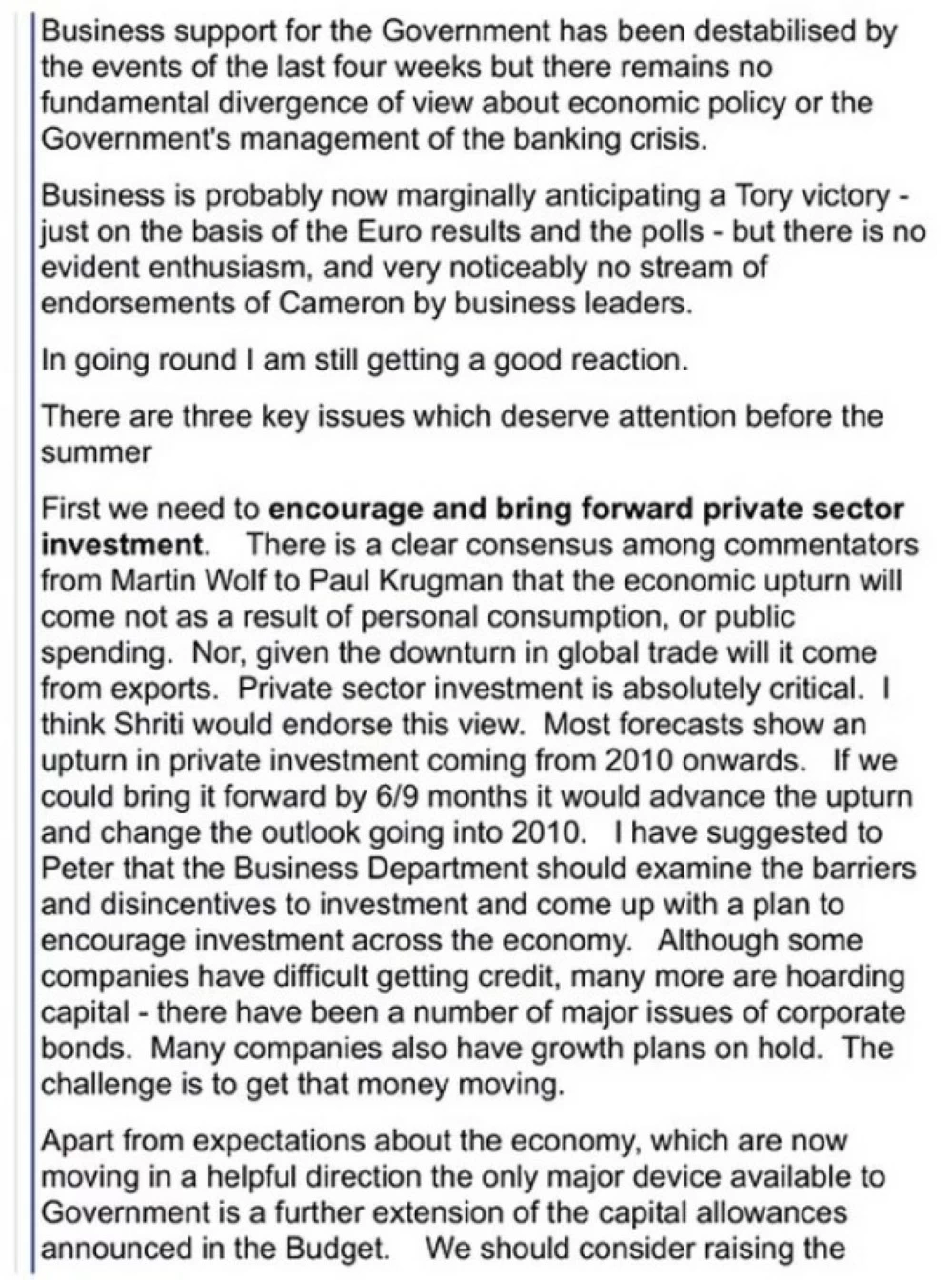 أما رئيس الوزراء الأسبق غوردون براون، فقد أعلن أنه طلب فتح تحقيق رسمي حول تسريب معلومات سرية من وزارة الأعمال خلال الأزمة المالية العالمية، مشيراً إلى أنه كان قد طالب بذلك سابقاً دون أن يتم العثور على سجلات ذات صلة.