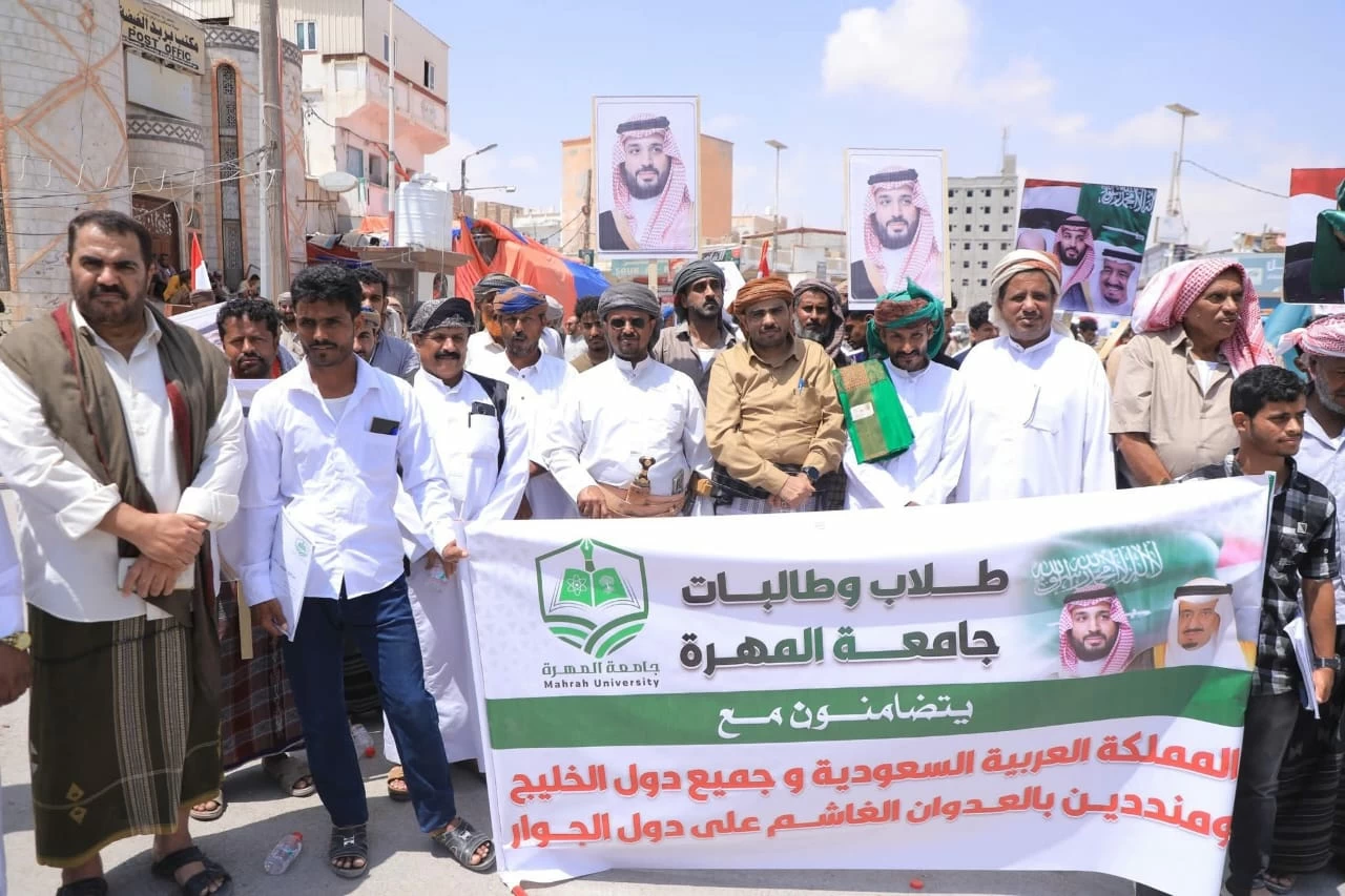 ورفع المتظاهرون في مدينة الغيضة عاصمة محافظة المهرة ومدينتي المكلا وسيئون في حضرموت صور القيادة السعودية، مؤكدين تضامنهم الكامل مع السعودية والدول العربية الشقيقة، وتنديدهم بالاعتداءات الإيرانية التي تستهدف أمن واستقرار المنطقة.