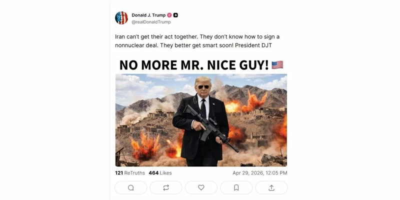 The post was accompanied by a picture of him wearing sunglasses and holding a machine gun, with destruction behind him in one of Iran's cities, and the image carried the phrase "No more Mr. Nice Guy," or "The era of the nice guy is over."