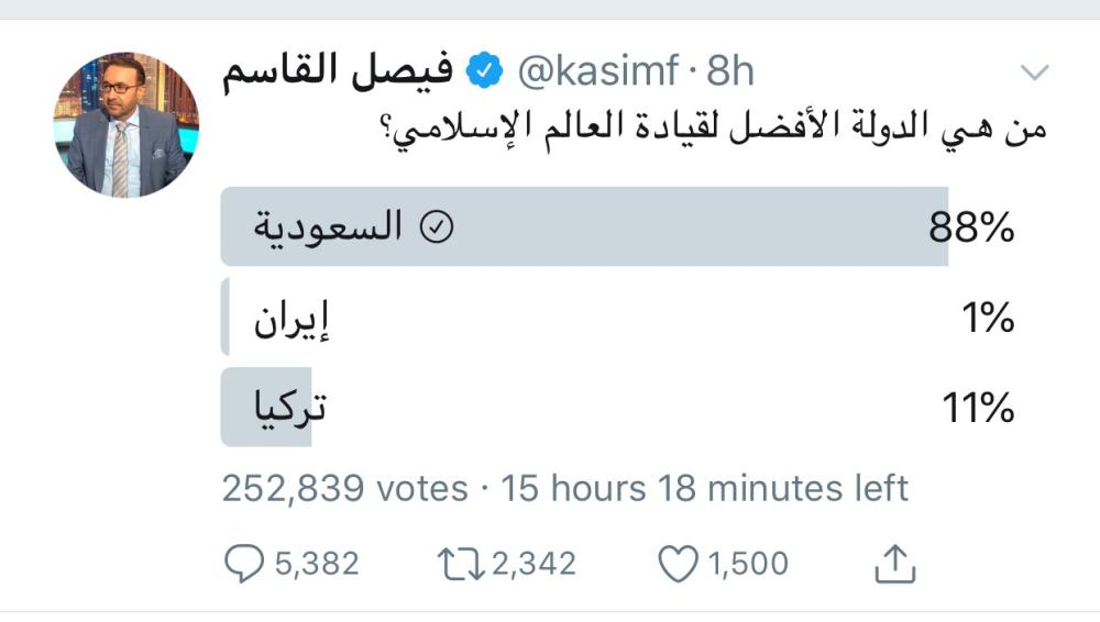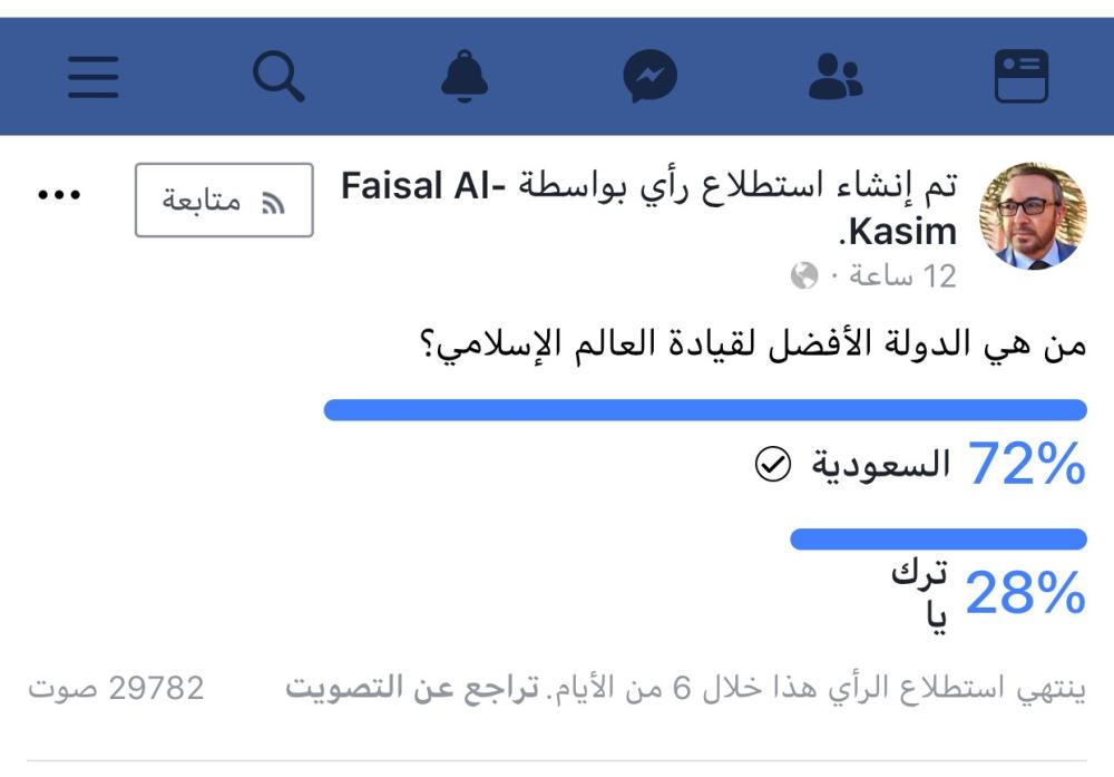 ولتأكيد اتهامه للمشاركين، عرض القاسم نفس الاستطلاع على منصة «فيسبوك»، التي أظهرت حينها قلة عدد المشاركين وتقدم إحدى الدول، وأثبت أن «فيسبوك» أكثر صدقية، وسرعان ما شارك السعوديون والخليجيون والعرب في الاستطلاع ليصل عدد المشاركين فيه إلى نحو 30 ألف مشارك، قال 72% منهم إن السعودية هي الدولة الأفضل لقيادة العالم الإسلامي.