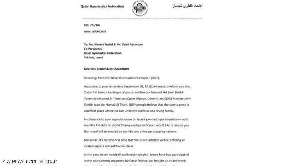 ونشرت وسائل إعلام إسرائيلية صورة للرسالة القطرية الموجهة من الاتحاد القطري للجمباز، إلى جمعية الجمباز الإسرائيلية، وتحمل تاريخ 29 أبريل 2018.