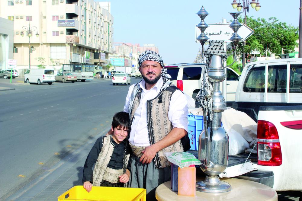 ويضيف: اتخذت من أحد الشوارع الرئيسية في تبوك موقعا لبيع شراب التوت والعرقسوس والورد، بجانب إبريقه النحاسي ولباسه الخاص. وقال: يقبل الناس كبارا وصغارا على شراء هذا المشروب، خصوصا في شهر رمضان، فهو شراب الفقراء والأغنياء،