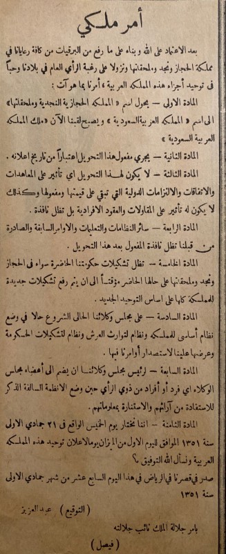 في عهد الملك فيصل بن عبدالعزيز - رحمه الله - صدر مرسوم ملكي رقم م/9 بتاريخ 24/4/1385هـ حدد فيه أول الميزان، الموافق 23 سبتمبر من السنة الميلادية هو تاريخ اليوم الوطني السعودي، وهو تاريخ توحيد المملكة العربية السعودية، حيث أصدر الملك عبدالعزيز المرسوم الملكي رقم 2716 وتاريخ 17 جمادى الأولى عام 1351هـ، الذي قضى بتحويل اسم الدولة من مملكة الحجاز ونجد وملحقاتها إلى المملكة العربية السعودية، ومن حينها أصبحت المملكة العربية السعودية تحتفل بهذا اليوم، حيث يستقبل ملك المملكة التهاني بهذه الذكرى وتقام الاحتفالات بهذه المناسبة.