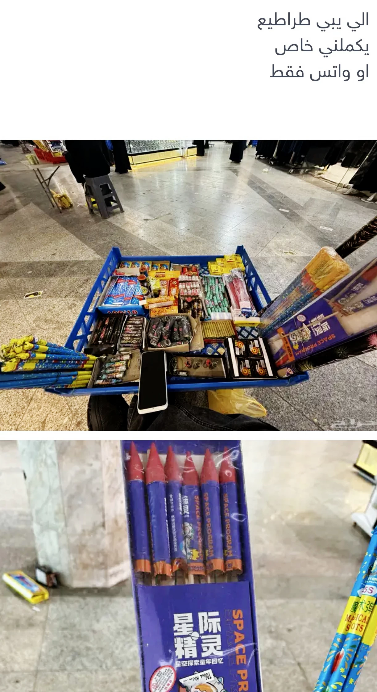 العروض لم تقتصر على البيع بالتجزئة، بل شملت البيع بالجملة أيضاً. أحد الباعة الذي يعرّف نفسه باسم مستعار «فتيني» عرض منتجاته عبر الرسائل الخاصة، محدداً الأسعار والمسميات بوضوح: «صواريخ الشدّة: 12 حبة بـ25 ريالاً، الكبريت: 60 حبة بـ25 ريالاً، نافورة طلقات 15 لوناً: 15 ريالاً»، وغيرها من الأصناف والأنواع.