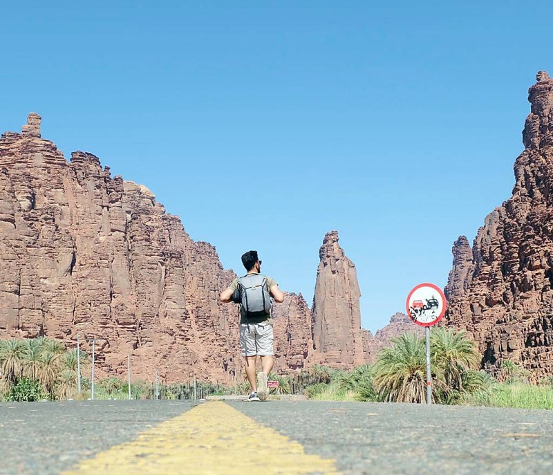 سائح في طريقه إلى وادي الديسة في «نيوم» بمنطقة تبوك لممارسة رياضة المشي الجبلي (الهايكنج).
