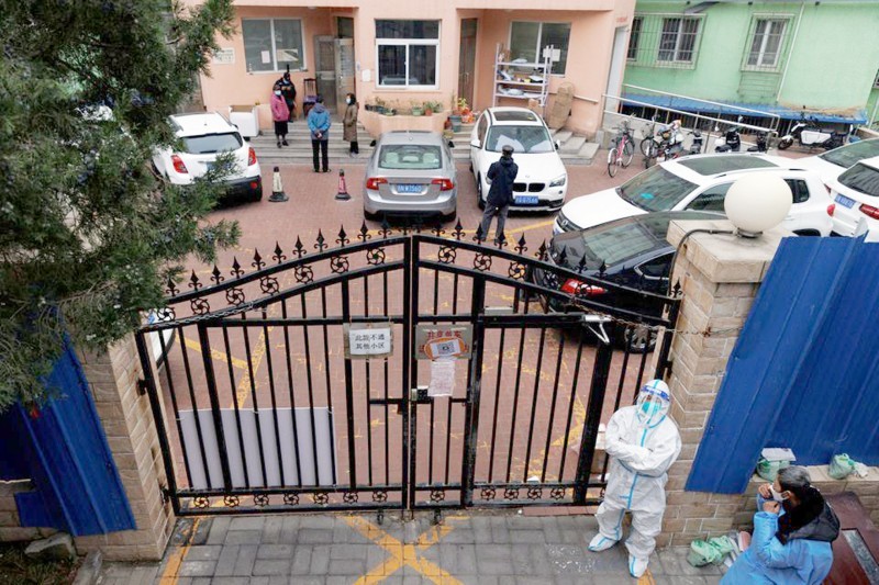 كادر صحي يحرس بوابة مجمع سكني تم إغلاقه في بكين. (وكالات)