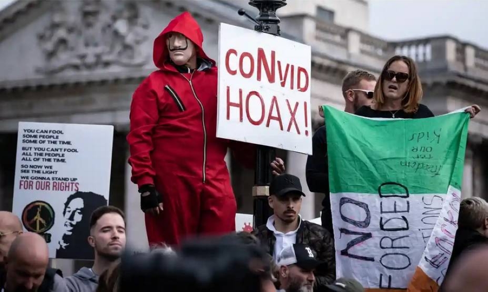 أرشيفية لمظاهرة قام بها أنصار «نظرية المؤامرة» في ميدان الطرف الأغر بلندن في سبتمبر 2020. (وكالات)