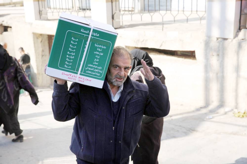 •• بالنسبة للأمن الغذائي فيهدف لتأمين مواد وصناعة نوع من الاستقرار وسد النقص في هذا المجال بشكل عام، وأول وأهم مادة هي الطحين، لذلك كل طائرة تحمل كمية كبيرة من الطحين، إضافة إلى سلة غذائية بوزن 70 كيلوغراماً تكفي الأسرة المؤلفة من ستة أشخاص لمدة شهر، تحتوي على طحين، أرز، شعيرية، برغل، عدس، زيت الطهي، شاي، سكر، هدفنا من هذه السلة المعيارية تأمين حاجات الأسرة لمدة شهر، وهذه السلة التي توزع في كل العالم، ولكن محتوياتها تختلف تبعاً لكل منطقة، فأهل الشام مثلاً يأكلون الأرز والشعيرية ويشربون الشاي، وفي الوقت ذاته أمّنّا حقيبة الإيواء، التي تحتوي على معدات الطبخ والأواني المنزلية اللازمة، وحقيبة دفء الشتاء التي تضم ملابس شتوية داخلية وخارجية لأسرة مؤلفة من ستة أشخاص، تبعاً لأزمة الشتاء ونقص المحروقات والملابس الشتوية، إضافة إلى سلة النظافة لما لها ارتباط بالعوامل الصحية. إدارة مختصة بالرقابة• أهم ما في الأمر، كيف تتم الرقابة على توزيع المساعدات؟