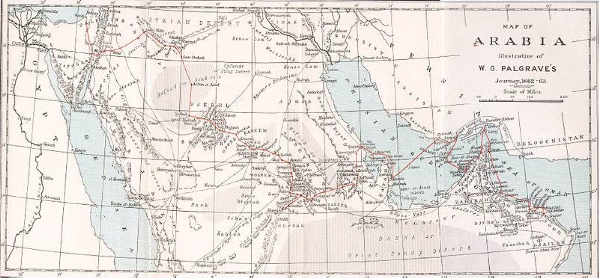 However, our discussion here will be about another traveler, the British "William Gifford Palgrave," who ranks second in importance after Charles Didier among the Western travelers who reached and roamed in the Arabian Peninsula, arriving in 1862. The reason is his authorship of a two-volume book titled "The Story of a Journey Through Central and Eastern Arabia," which proves that its author was cultured and knowledgeable with many political, social, religious, and worldly insights. It is worth noting that the man faced sharp accusations after his death from some Western travelers (especially John Philby), who claimed that he did not undertake his journeys to Central and Eastern Arabia, and that what he wrote was merely literary manifestations and fantasies from a gifted writer. However, this campaign was refuted by prominent European travelers such as Charles Doughty, Lady Blunt, and the French archaeologist Jacqueline Pirenne, all of whom praised the man's writings and investigations, attesting to his efforts and travels, and confirming that his books are an important addition to travel literature.