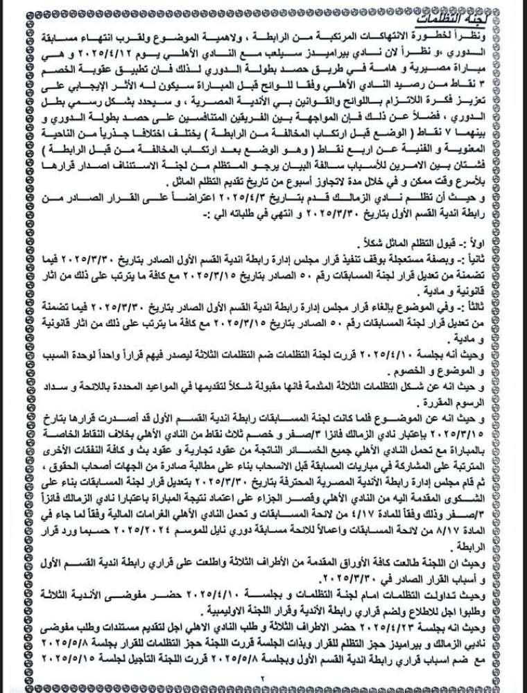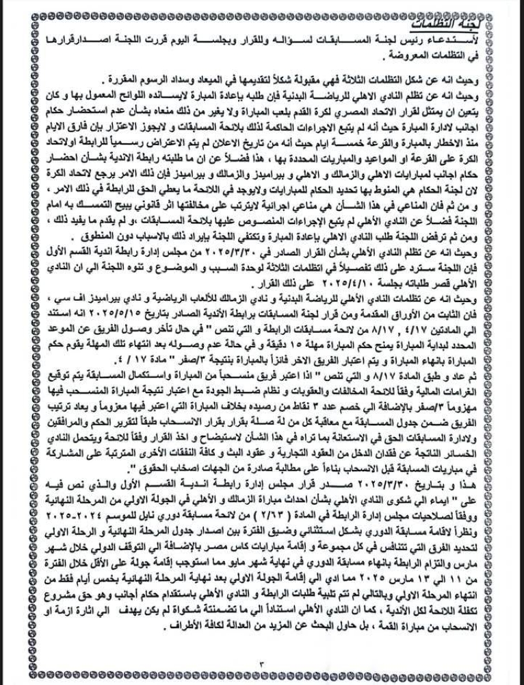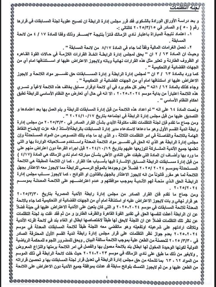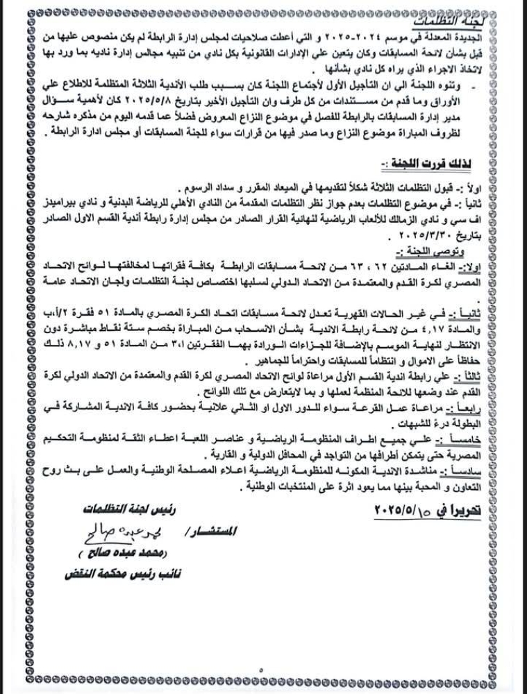 وبعد دراسة التظلمات وضمها في جلسة 10 أبريل، واستدعاء مدير إدارة المسابقات بالرابطة للإيضاح، قررت اللجنة في جلستها المنعقدة اليوم 15 مايو قبول التظلمات شكلاً، لكنها رفضتها في الموضوع، مؤكدة أن قرار الرابطة الصادر في 30 مارس نهائي وغير قابل للطعن وفقاً للمادتين 62 و63 من لائحة المسابقات المعدلة لموسم 2024 - 2025، والتي تمنح مجلس إدارة الرابطة صلاحية اتخاذ قرارات نهائية في الظروف الاستثنائية.