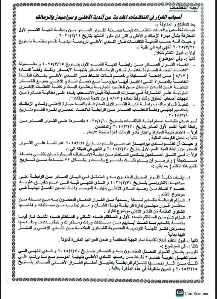 وتقدم النادي الأهلي بتظلم في 24 مارس 2025، طالب فيه بإلغاء قرار الرابطة وإعادة المباراة بتحكيم أجنبي، ثم عدل طلبه في 10 أبريل 2025 للتركيز على إلغاء قرار 30 مارس 2025.