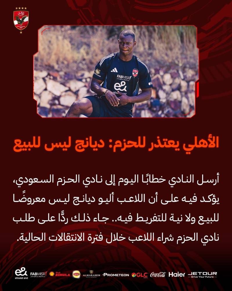 Al Ahly apologized to Al Hazm in a statement on its website, confirming that Aliou Dieng is not for sale and there is no intention to part with him.