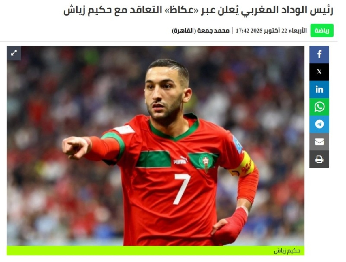 Previously, "Okaz" had exclusively reported statements from Wydad's president Hicham Ait Menna, last Wednesday, confirming the signing of Hakim Ziyech until 2027, with an option to extend.