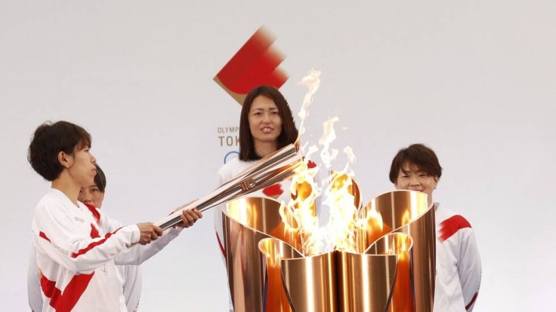 وقامت لاعبات المنتخب الياباني لكرة القدم بإشعال المشعل بعد نقل الشعلة من اليونان.