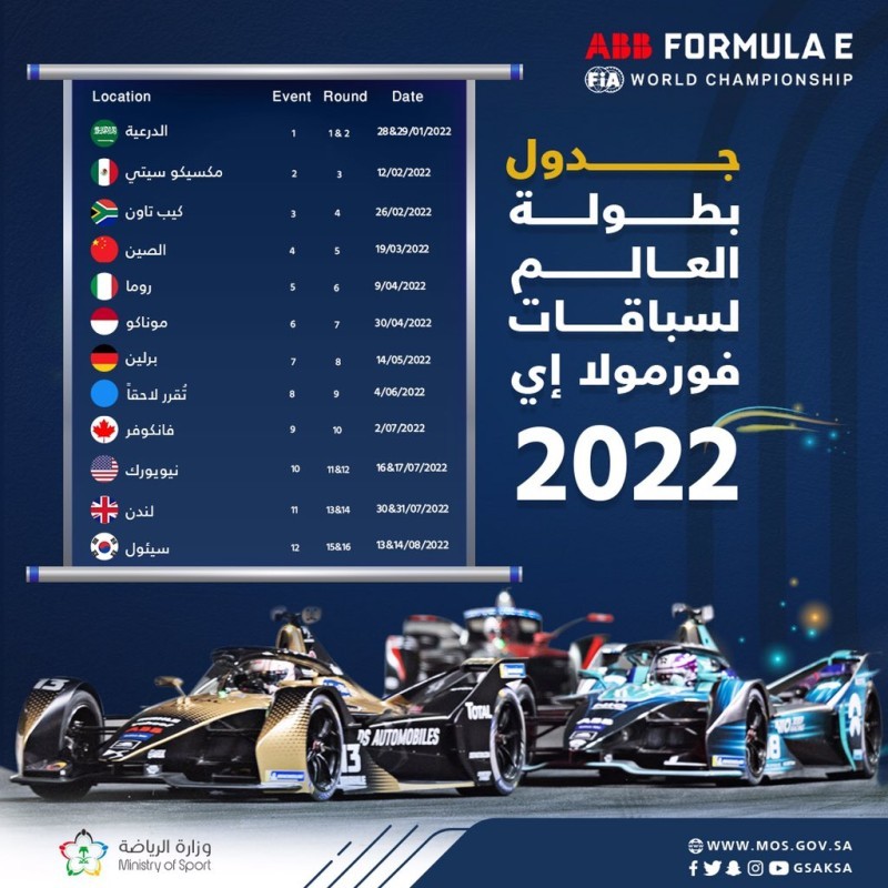 أعلن الاتحاد الدولي للسيارات، استضافة «الدرعية التاريخية» الجولتين الأولى والثانية من سباق الفورمولا إي للسيارات الكهربائية، وللسنة الرابعة على التوالي، يومي 28 و29 من يناير 2022.