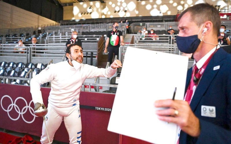 الإيطالي ماركو فيشيرا يتجادل مع الحكم بعد خسارته في النزال ضد الروسي سيرجي بيدا في مباراة ربع نهائي المبارزة للرجال خلال دورة الألعاب الأولمبية طوكيو 2020 في صالة ماكوهاري ميسي في مدينة تشيبا سيتي، محافظة تشيبا، اليابان. (Getty)