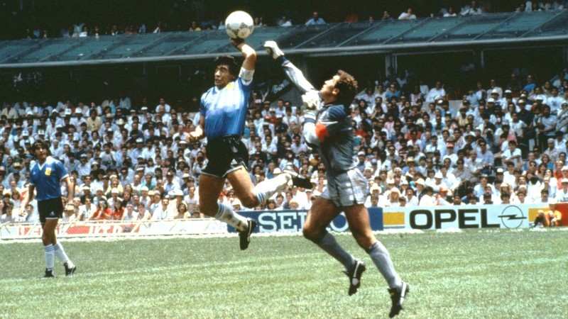 وسجل مارادونا هدفين خلال مباراة ربع النهائي في مكسيكو سيتي في 22 يونيو 1986، بعد 4 سنوات فقط من خوض بريطانيا والأرجنتين حربا على جزر فوكلاند. وتم احتساب الهدف الأول للاعب الأرجنتيني بضربة رأس لكن الإعادات أظهرت أن الكرة ارتدت من قبضة مارادونا بعيدا عن أنظار الحكم الدولي السابق التونسي علي بن ناصر.