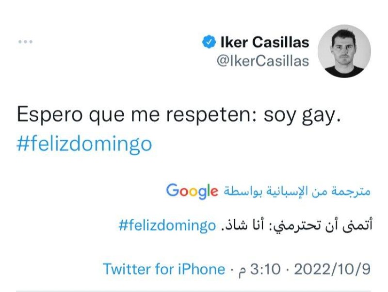 أثار أسطورة كرة القدم الإسبانية إيكر كاسياس جدلا واسعا في مواقع التواصل الاجتماعي، بعد أن نشر تغريدة عبر حسابه في تويتر قال فيها إنه «شاذ».