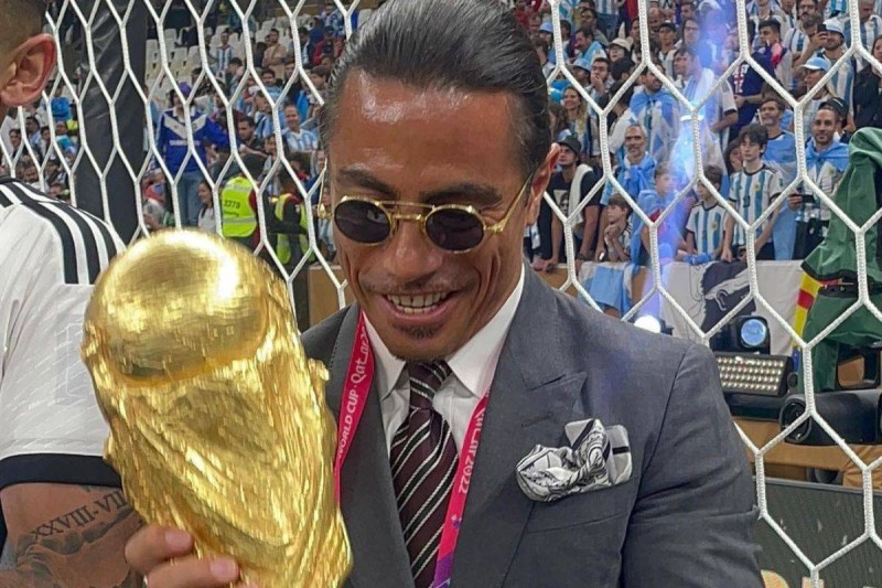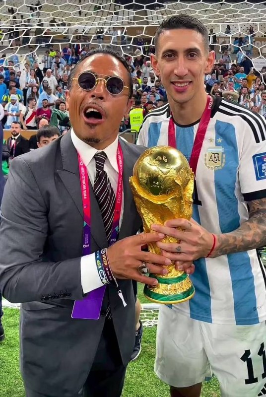 وشوهد صاحب المطعم الشهير وهو يحمل الكأس ويضايق لاعبي الأرجنتين لالتقاط صور فوتوغرافية بعد فوزهم على فرنسا الأحد الماضي.