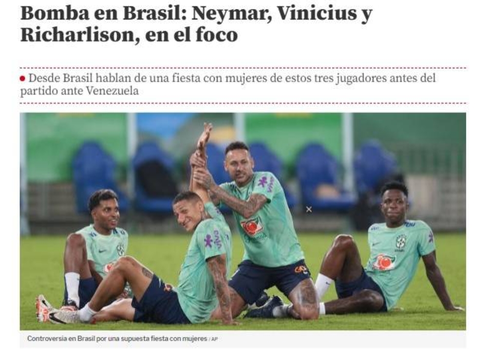 أكدت تقارير صحفية إسبانية اليوم (السبت)، تورط ثلاثي منتخب البرازيل نيمار وفينيسيوس جونيور وريتشارليسون في مزاعم فضيحة أخلاقية بمعسكر منتخب السامبا قبل مباراة ضد فنزويلا انتهت بتعادل مخيب 1-1 يوم الجمعة، ضمن منافسات الجولة الثالثة من تصفيات أمريكا الجنوبية المؤهلة لمونديال كأس العالم 2026.