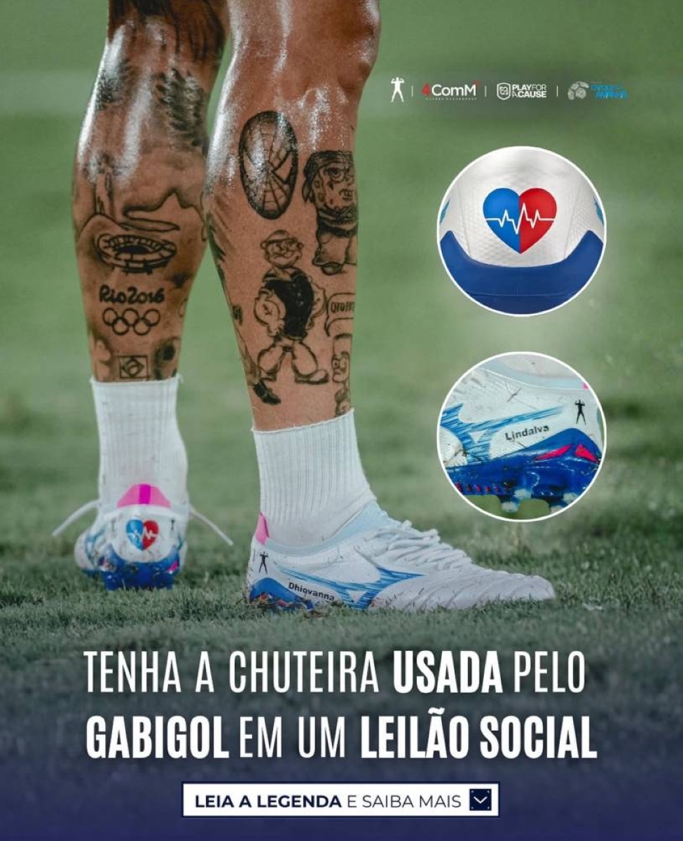 The shoes worn by Gabi Gol were white with blue and pink details, featuring hearts divided between red (the color of Flamengo) and blue (the color of Cruzeiro), symbolizing the player's divided heart between the two clubs, on an emotionally charged night at the famous Maracanã stadium in Rio de Janeiro.