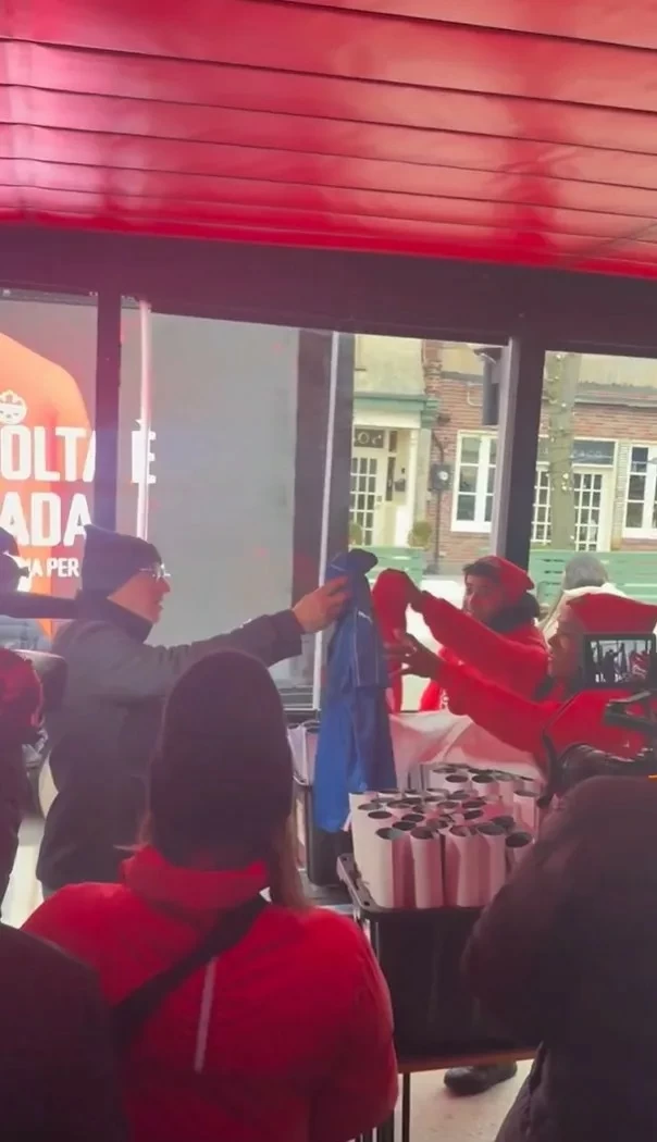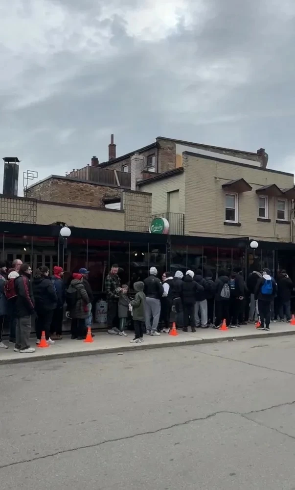 At the front of the line, fans were seen entering the building to receive their Canadian jerseys, where one fan was filmed handing a blue jersey to a volunteer and then receiving a red one with the Canada logo.