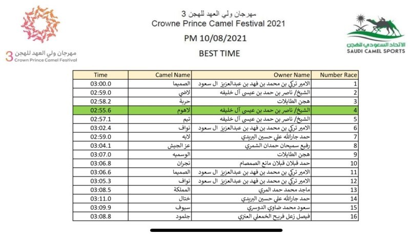 فيما فازت بثلاثة أشواط هجن الشيخ ناصر بن حمد آل خليفة في الفترة المسائية لاهوم، لاضي، تيم، اذ فاز القعود لاهوم بالمركز الأول وأفضل توقيت في (2.55) دقيقه في الشوط الرابع، فيما فاز القعود لاضي بالمركز الأول، في الشوط الثاني، والبكرة تيم بالمركز الأول في الشوط الخامس، وتفصيلاً تواصلت لليوم الثالث على التوالي، منافسات مهرجان ولي العهد للهجن في نسخته الثالثة، في الأشواط المخصصة لسن المفاريد (بكار - قعدان) عام ومسافته 2 كلم، على فترتين صباحية ومسائية، وسط مشاركة قوية من هجن الرموز ومؤسسات الهجن العملاقة.