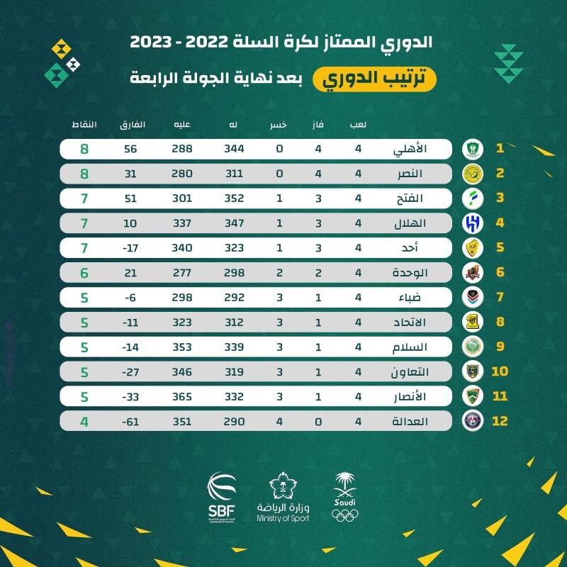 وحلّ الهلال بالمركز الرابع بعد فوزه على نظيره الأنصار 101-91، بينما الأخير حلّ بالمركز الحادي عشر برصيد 5 نقاط.